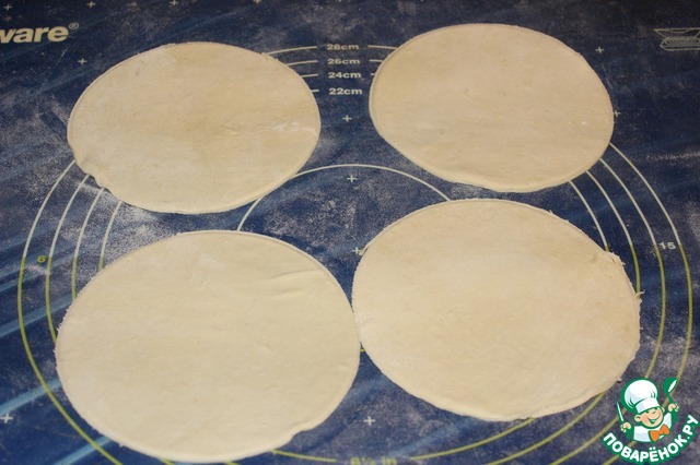 Тесто разморозить и раскатать на посыпанной мукой поверхности так, чтобы получилось 8 кругов с чайное блюдце.