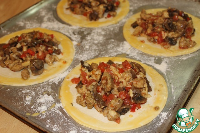 Разложить 4 круга теста на присыпанный мукой противень, распределить начинку, смазать края взбитым яйцом.
