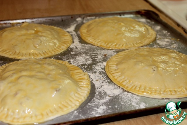 Закрыть оставшимися кругами из теста и прижать края вилкой. Смазать оставшимся взбитым желтком.