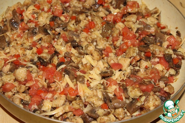 Сыр натереть на крупной терке. Соединить мясо, грибы, помидоры, перец, сыр и всё аккуратно перемешать, посолить и поперчить по вкусу.