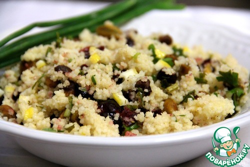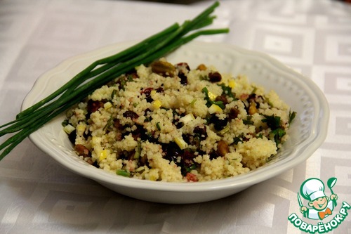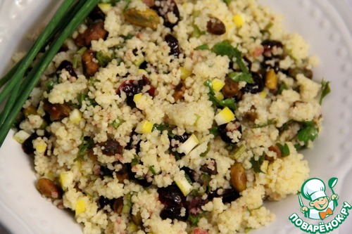 Готовый кускус добавить к приготовленной смеси сухофруктов и фисташек и хорошо перемешать.