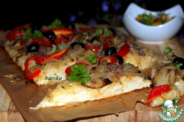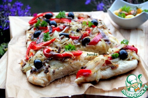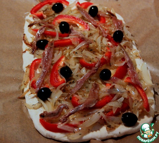 Распределить по лепешке обильно жареный лук, кусочки сладкого перца, филе анчоусов и черные маслины (визуально можно уже и съесть!).