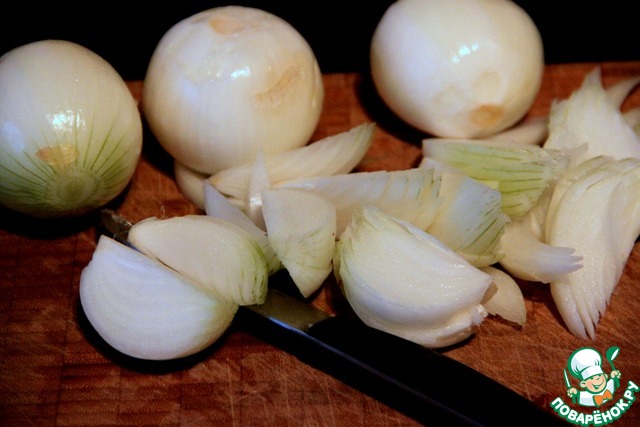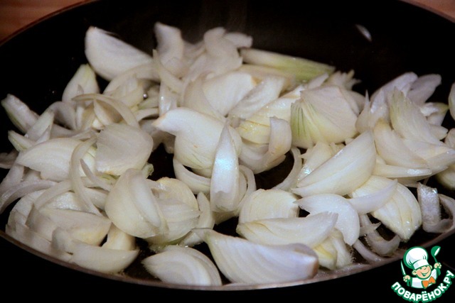 В это время подготовить начинку. Лук нарезать перышками (самая слезоточивая работа)