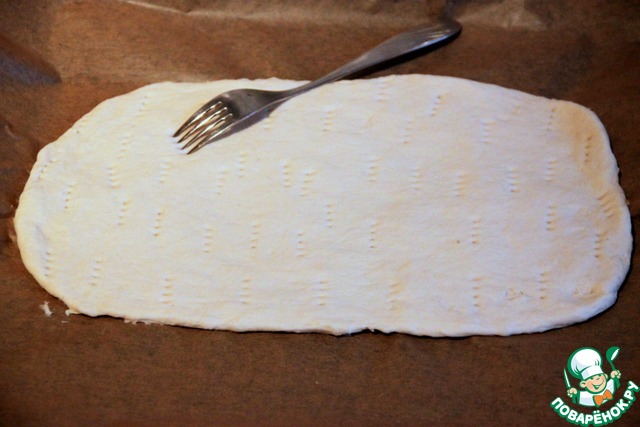 Подошедшее тесто обмять, раскатать в овальную лепешку, толщиной 3 мм, выложить на противень, покрытый бумагой для выпечки. Наколоть лепешку вилкой.