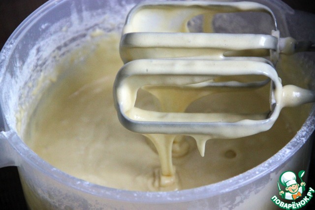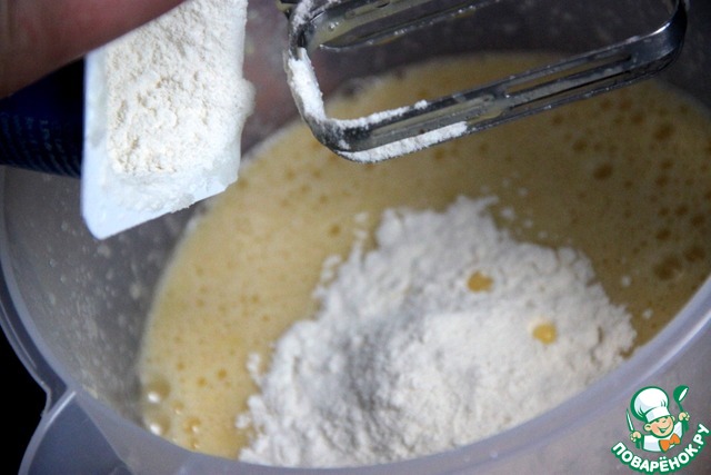 Добавить муку ( 3-4 йогуртовых стаканчика, в зависимости от клейковины муки и желаемой пористости кексов).