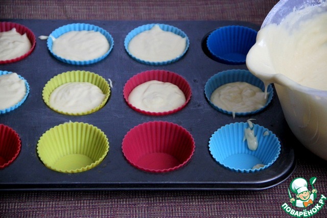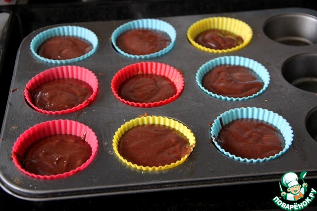 Разлить тесто по подготовленным формочкам на 3/4. Отправить в разогретую духовку на 20-25 мин.