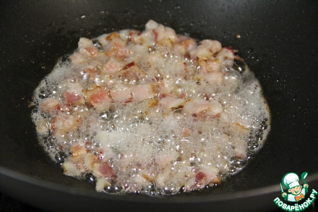 На сковороде разогреваем оливковое масло и добавляем порезанный бекон. Жарим помешивая 5-8 минут.