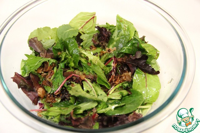В большую тарелку кладем листья салата, добавляем бекон с луком и слегка перемешиваем.