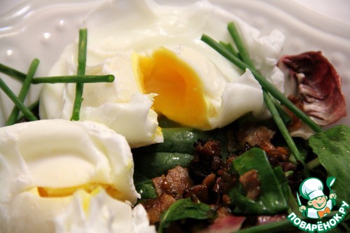 На порционную тарелку кладем салат и сверху яйцо пашот.