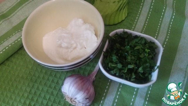 Пока кабачки "стекают" подготовим соус - мягкий нежирный творог (или сметану или натуральный йогурт) смешаем с нарезанной петрушкой (или любой зеленью) и чесноком. Посолить, поперчить по вкусу. Убрать в холодильник.