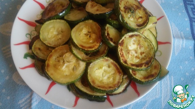 В сковороде разогреть немного растительного масла и обжарить кабачки с двух сторон на довольно большом огне под крышкой. Выкладывать на тарелку, пересыпать 1 зубчиком мелко нарезанным чесночка (больше для запаха, чем острого вкуса).