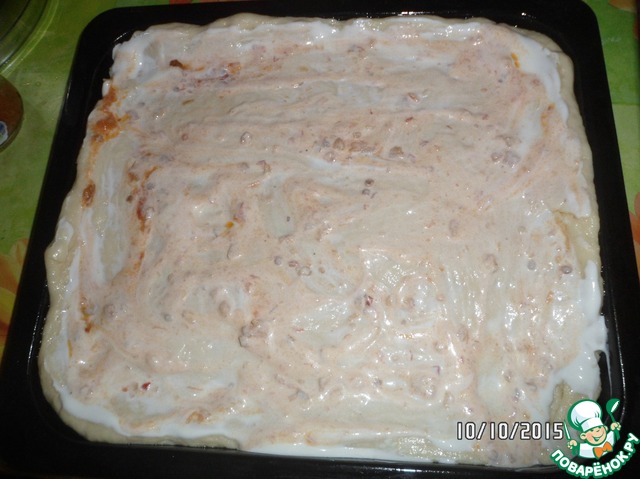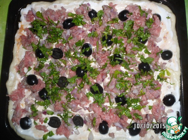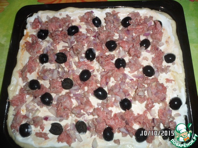 Идеально, если у вас готовое тесто! Тогда этот шаг можно пропустить. Но как это обычно бывает: тесто закончилось, а пиццы хочется. Именно в этом случае быстренько в миску, где будем замешивать тесто кладем сметану, соль и сахар (если хотите 1 ст. л.). Энергично все это перемешиваем, добавляем туда растительное масло и затем подмешиваем муку с разрыхлителем до мягкого теста не липнущего к рукам. Тесто готово! Отложим его не надолго, а в это время нарежем тонкой соломкой мясо (у меня в этот раз фарш говяжий), мелко порубим репчатый лук и зелень, маслины и виноград на половики. Если виноград у вас с косточками, то лучше их все-таки убрать! Сыр натереть на крупной терке. Тесто отдохнуло, возвращаемся к нему. Раскатываем его по величине вашей формы (у меня 25*30 см) и намазываем сметаной и аджикой, если хотите по острее - добавьте аджики, посолите, поперчите.