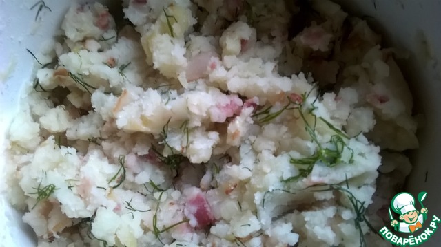 Картошку сварить, размять, бекон обжарить с луком до золотистого цвета, перемешать с пюре, добавить укроп.