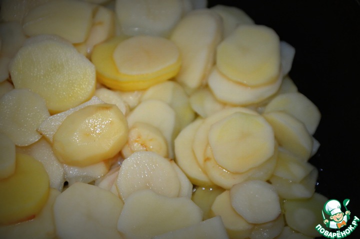 Минут через 7-10 после жарки картофеля, к нему добавляем яблоки - перемешиваем