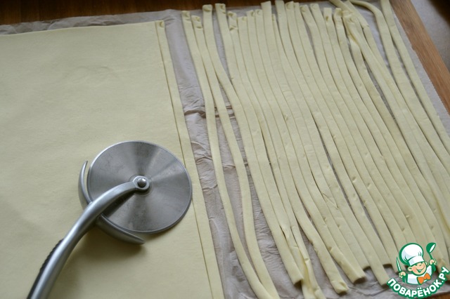 Слоеное бездрожжевое тесто нарезать на тонкие полоски.