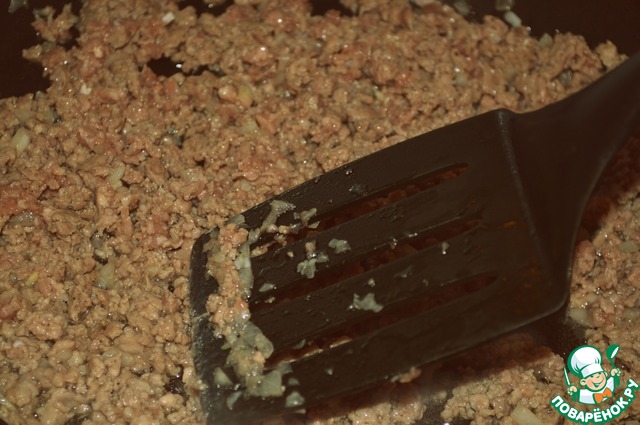 Обжарить фарш на масле до полуготовности, перемешивая лопаткой до рассыпчатости.