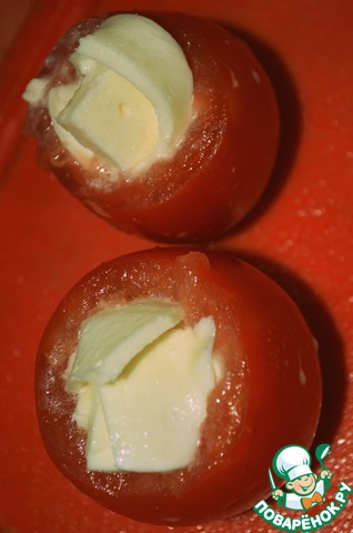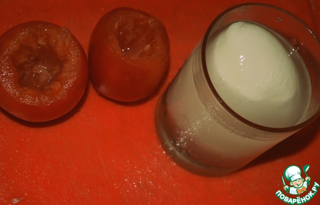 Подготовить помидоры. Вырезать чатсь мякоти и натереть солью (немного).