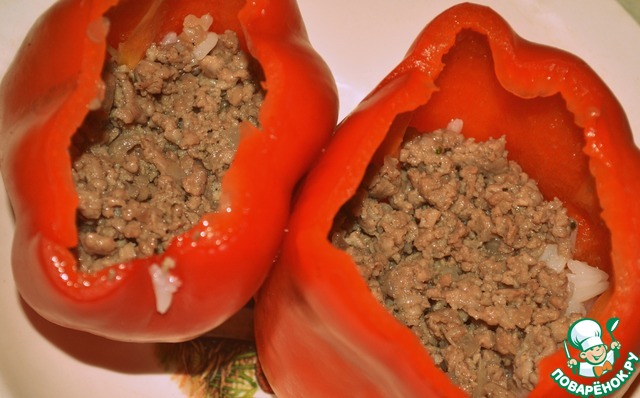 Пока варится рис, у перцев срезать верхушки и вынуть семена. Поставить их в подсоленную и поперченную воду на огонь. Поварить немного после закипания минуты две.