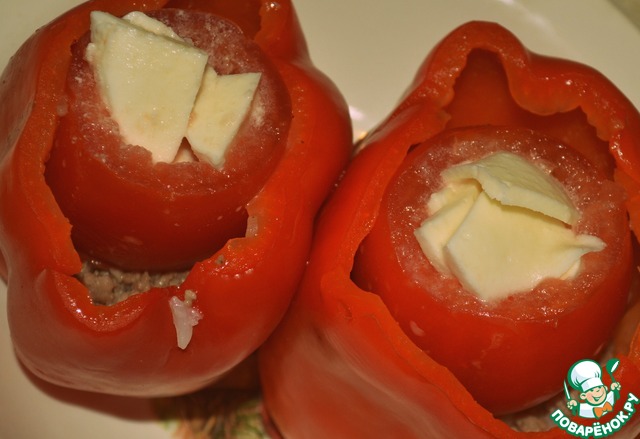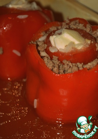 И доложить остатки риса и фарша по краям. Можно и ложкой, но удобнее руками. (Для ещё более эффектного результата, можно украсить сырной шапочкой). Выложить перцы на противень и залить примерно на четверть подсоленной томатной пастой, разбавленной водой. Поставить в духовку и при 180 градусах готовить около 20 минут.