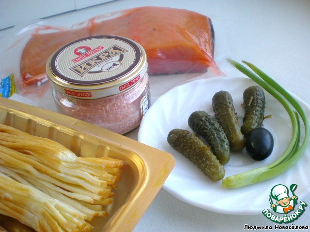 Я промазывала тресковой икрой, выкладывала сёмгу, оформляла корнишонами, маслинкой, зелным луком. Чтобы сделать корзиночку, сплела ручку из сыра, но это не обязательно.