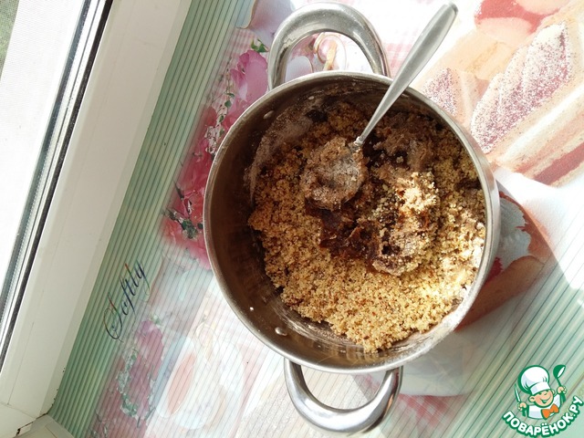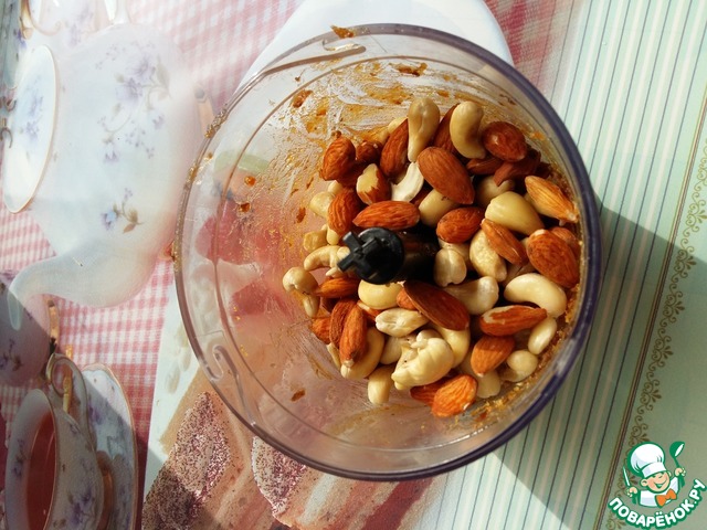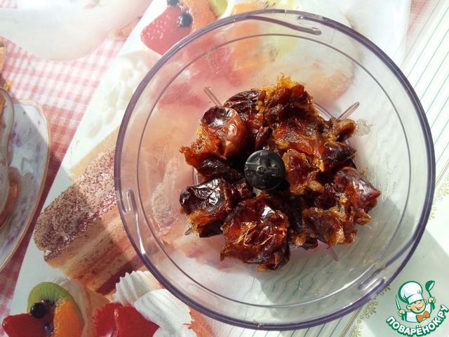 Финики замочить на 30 мин. Затем вынуть из них косточки и размельчить в блендере