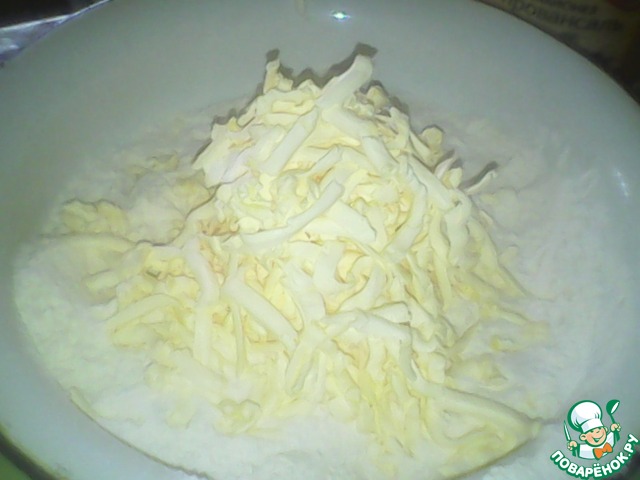 Спред натереть на терке, смешать хорошенько его с мукой и содой.