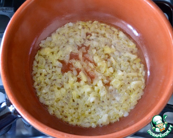 В сковороде, где будете готовить ризотто, разогреть оливковое и сливочное масло. Положить в сковороду лук и потушить до мягкости. Не зажаривать! Помешивая, готовить лук 3-4 минуты пока он не посветлеет (если начнет сильно зажариваться, можно добавить пол половника бульона).
