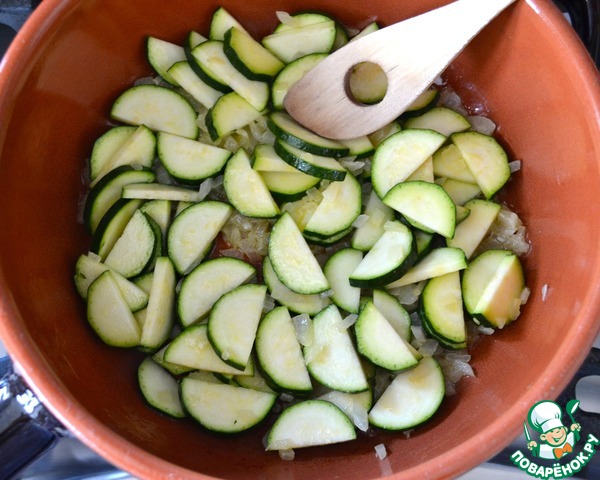 Добавить к луку нарезанные цуккини. Обжарить всё еще пару минут.