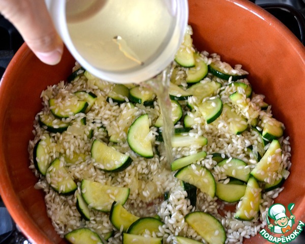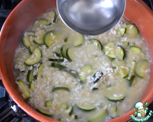 Добавить горячий (!) бульон и варить ризотто на среднем огне около 16-18 минут, до готовности риса, постоянно подливая бульон, по мере того, как жидкость будет испаряться!