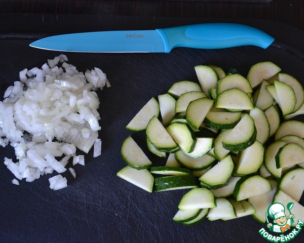 Сраху подготовить овощи: луковицу мелко нарезать, цуккини нарезать полукольцами (если крупный) или кружочками (если небольшой).