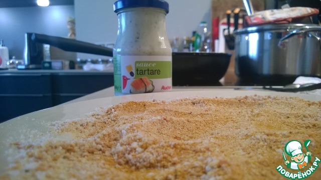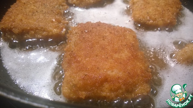 Окунаем кусочки филе в яйцо, затем обваливаем в сухарях. Отправляем жариться. Во время обжаривания солим.