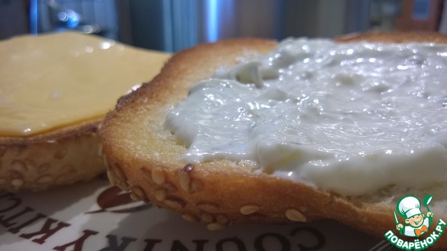 На булочку с одной стороны намазываем соус тар-тар. С другой стороны выкладываем ломтик сыра.