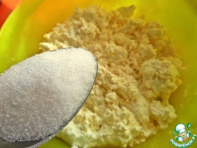 В творог любой жирности всыпаем сахар. Если готовите с изюмом, то достаточно 2 ст. л., но у меня ягода кислая, поэтому плюсуем ещё ложку!