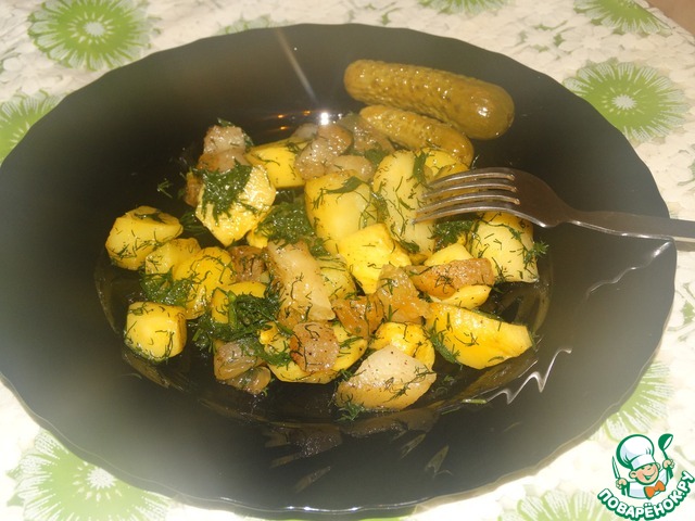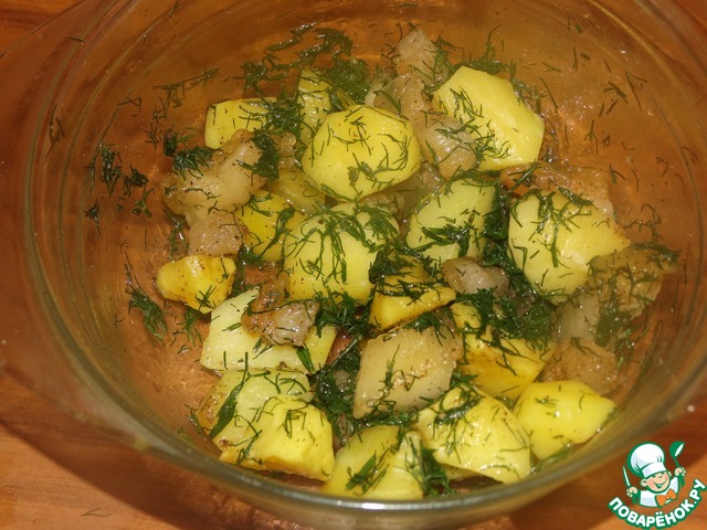 Укроп мелко нарезать. Высыпать в форму к картофелю с салом и перемешать.