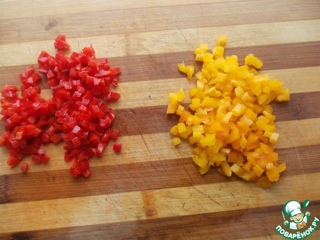 Перец мелко порубить, чем мельче, тем мягче он будет в омлете.