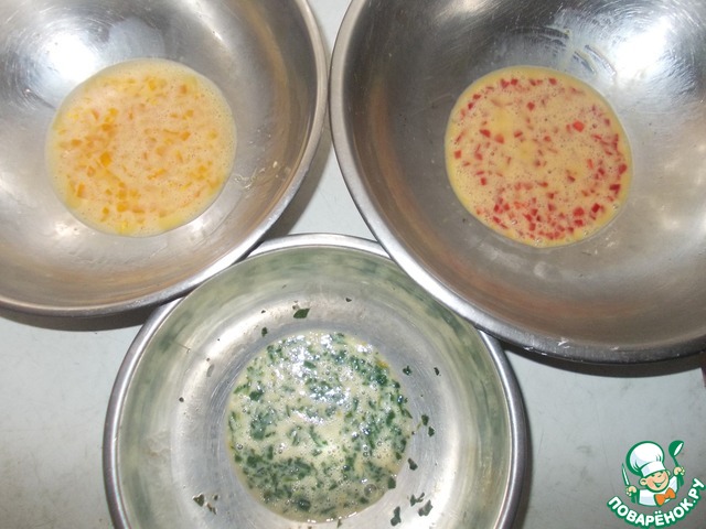 Также поступите и с третьим омлетом и сверните в него предыдущие два. Затем обжарьте на масле со всех сторон до золотистой корочки.