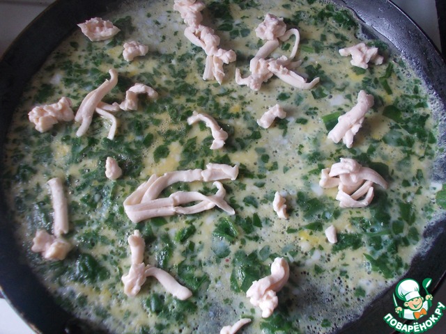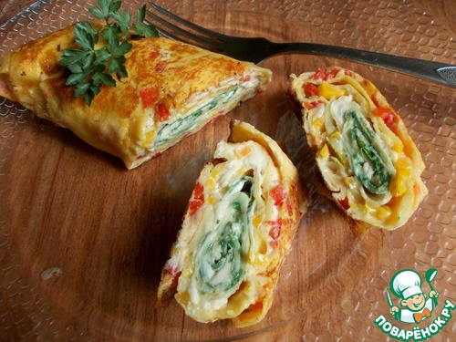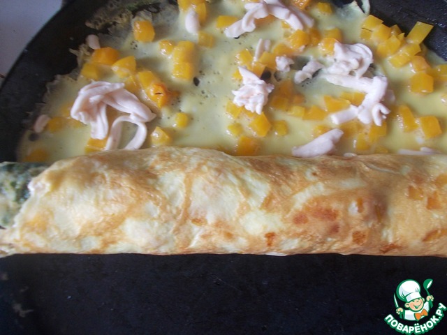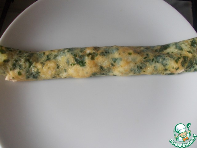 Также обжарьте второй омлет, только в конце положите на край предыдущий и сверните их уже вместе.