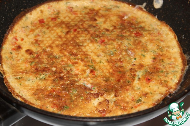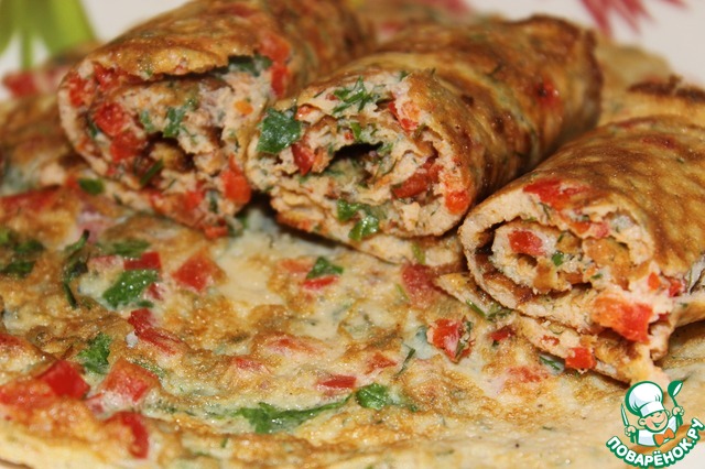 Для рулетиков яйца взбить миксером, добавить мелко нарезанный болгарский перец, зелень, соль и перец.