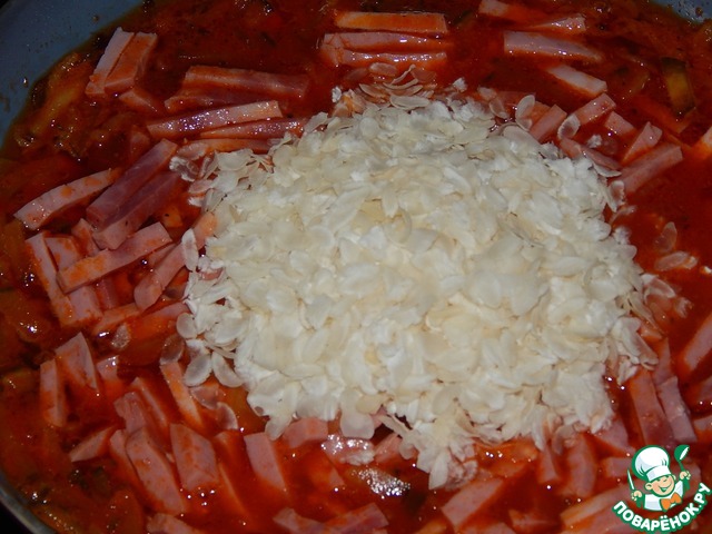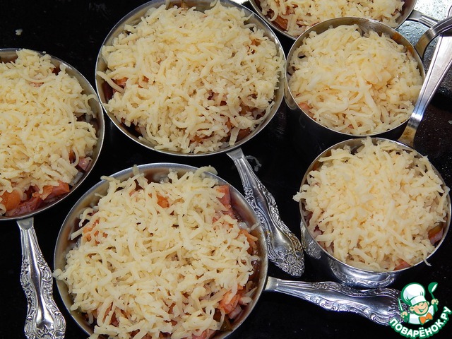 Сверху присыпаем мелко потертым сыром и ставим в разогретую до 180 град. духовку на 5-7 минут.