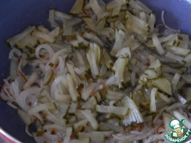 Выкладываем огурцы к луку и жарим еще 1-2 мин.