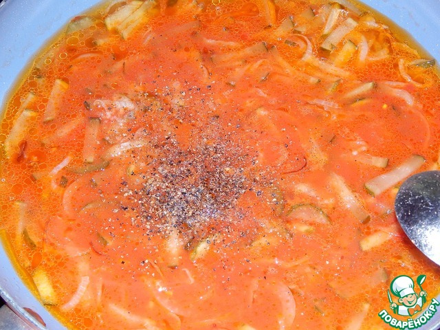 Добавляем воду, солим и перчим по вкусу, тушим 5-7 минут.
