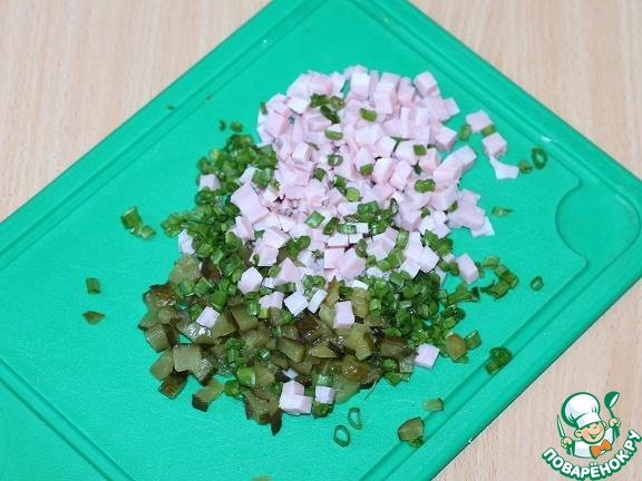 Ветчину, огурцы (лучше свежий салатный огурец) нарезать на маленькие кубики, зеленый лук мелко порубить. Добавляем порезанное к начинке и перемешиваем.