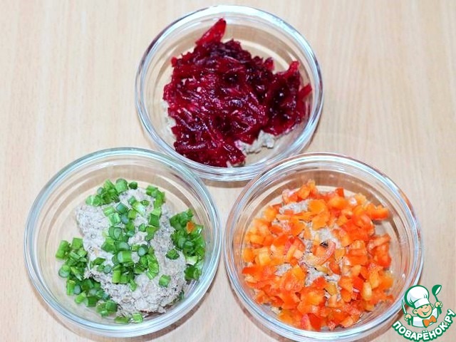 добавить мелко порубленный зеленый лук, тертую на крупной терке свеклу, мелко порезанный перец (корейская морковь по желанию) и отдельно в каждой чашке перемешать.