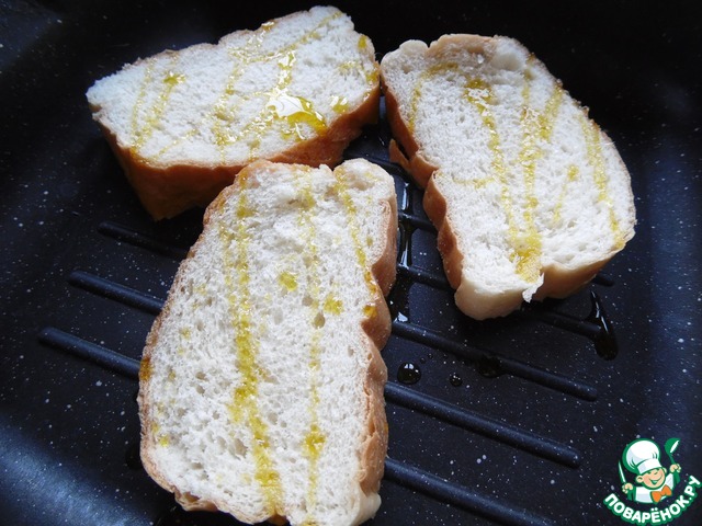 Ломтики хлеба сбрызнуть оставшимся маслом, подсушить на горячей сковороде-гриль.