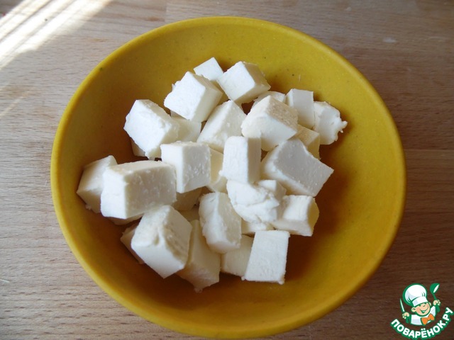 Фетаки нарезать небольшими кубиками. Подготовленные овощи и сыр выложить на хлеб.