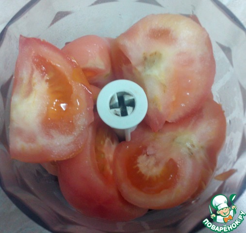 Помидоры ошпарить, порезать на половинки, уложить в блендер.