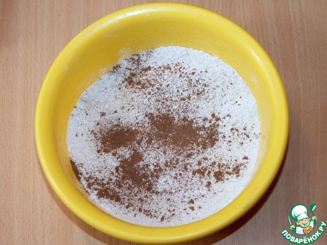 В большую миску просеять муку, разрыхлитель теста, какао-порошок и добавить сахар. Тщательно перемешать сухую смесь.