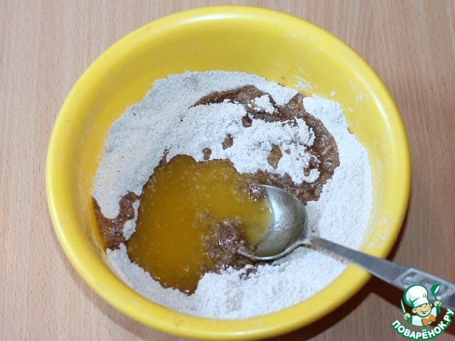 Растопить сливочный маргарин (или сливочное масло), немного остудить и ввести в сухую смесь. Перемешать.
