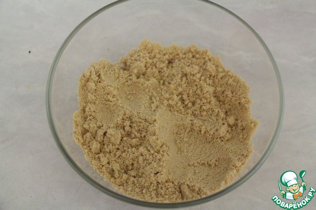 Выкладываем основу в форму. Предварительно подстелив пергамент! Придавливаем стаканом до нужной нам толщины коржа (1 см). Ставим в духовку разогретую до 170-180 на 10 мин!