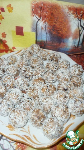 Смешать все ингредиенты в емкости. Смочить руки и скатать шарики. Затем каждый шарик обвалять в кокосовой стружке.